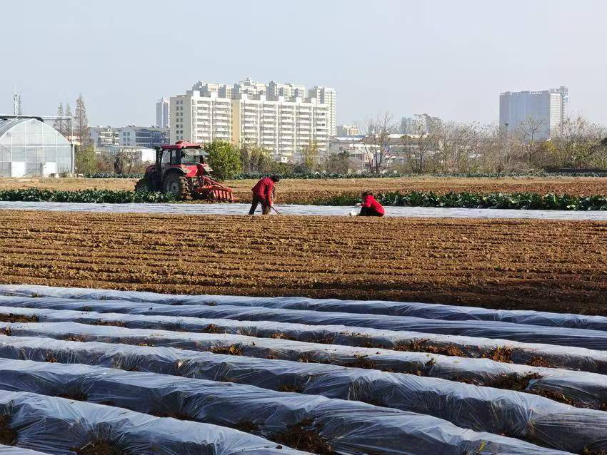 冬日时节,云梦县城关镇耕云种梦农业科技有限公司种植基地里,处处涌动着蓬勃生机。拖拉机铁犁翻卷着泥土,在田垄间有序穿梭;菜农们俯身忙碌,为娇嫩的土豆苗覆上薄膜,筑牢冬日保温屏障;连体大棚内,草莓藤蔓绿意盎然,工作人员正悉心打理枝叶;露天菜畦间,红菜薹鲜嫩欲滴,白合花菜圆润饱满,丰收的气息扑面而来。
