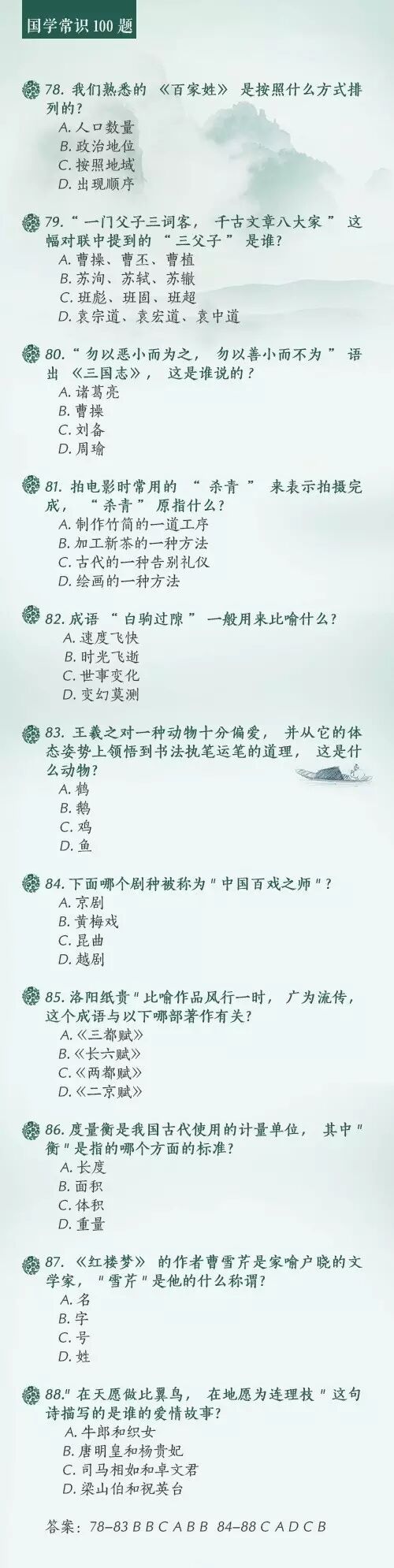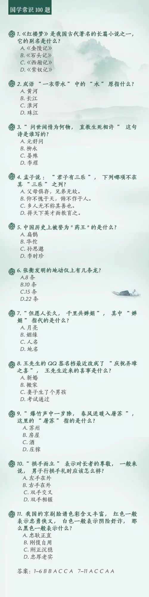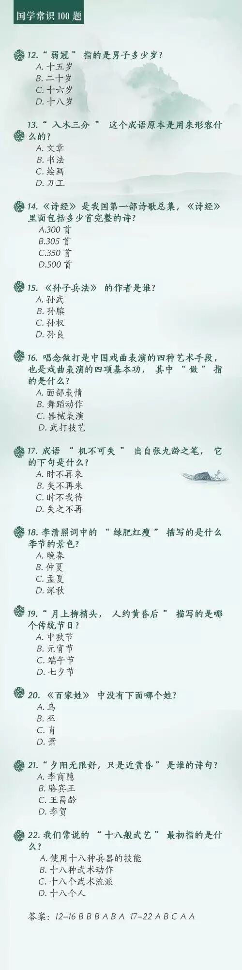 “弱冠”指多少岁的男子?西湖白堤的得名与哪位诗人有关?“三更半夜”的“三更”是几点?宫殿门口石狮子的摆放有什么讲究?“十八般武艺”最初指什么?……中华文化博大精深,100个经典国学常识,你到底了解多少?每张图底部附有答案,看看你能作对几道?