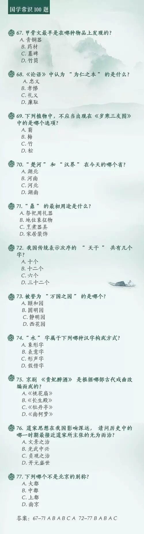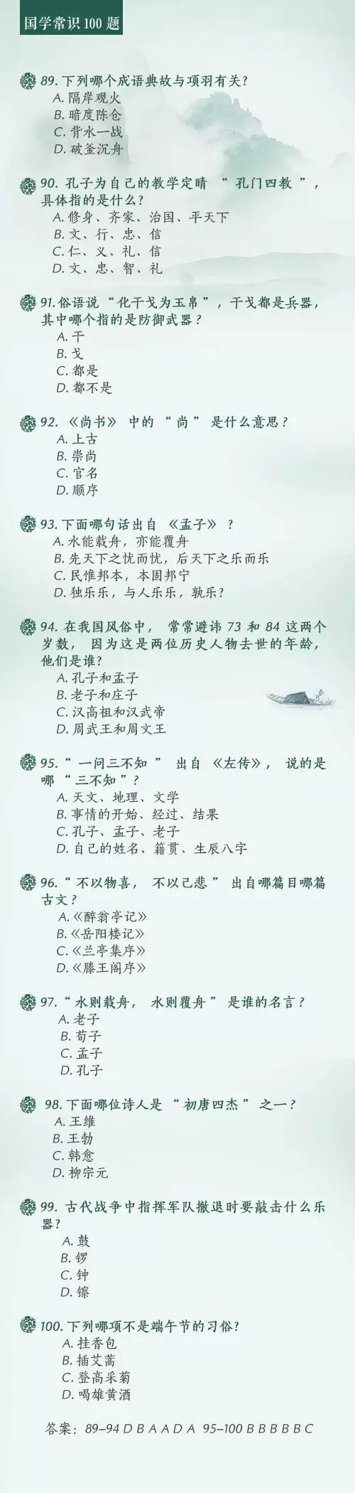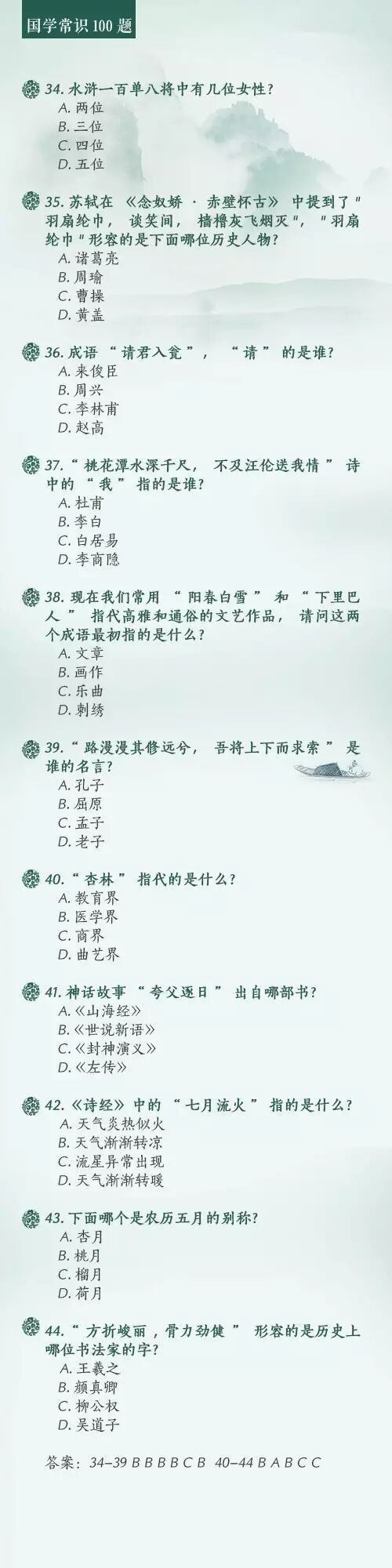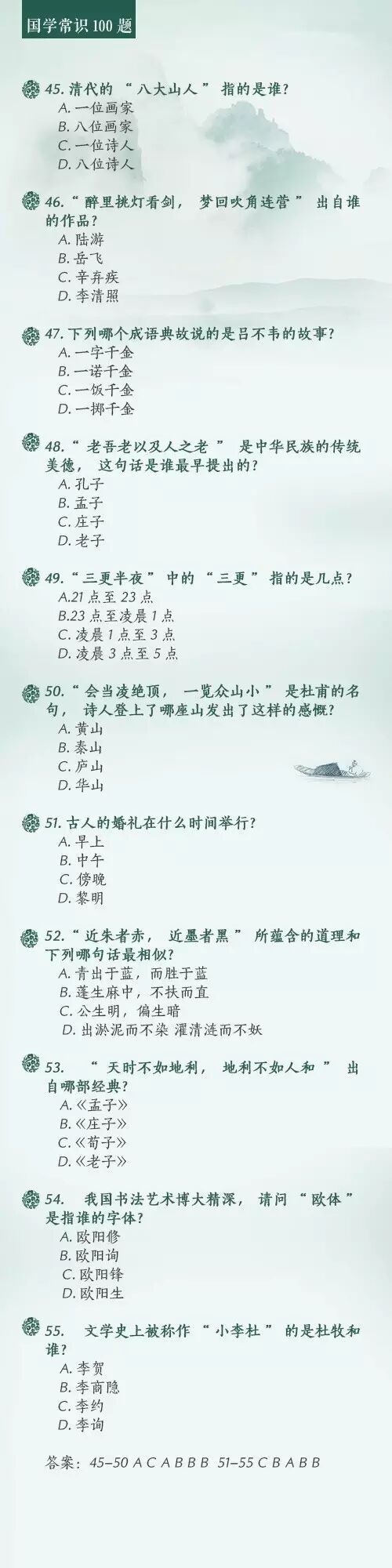 “弱冠”指多少岁的男子?西湖白堤的得名与哪位诗人有关?“三更半夜”的“三更”是几点?宫殿门口石狮子的摆放有什么讲究?“十八般武艺”最初指什么?……中华文化博大精深,100个经典国学常识,你到底了解多少?每张图底部附有答案,看看你能作对几道?