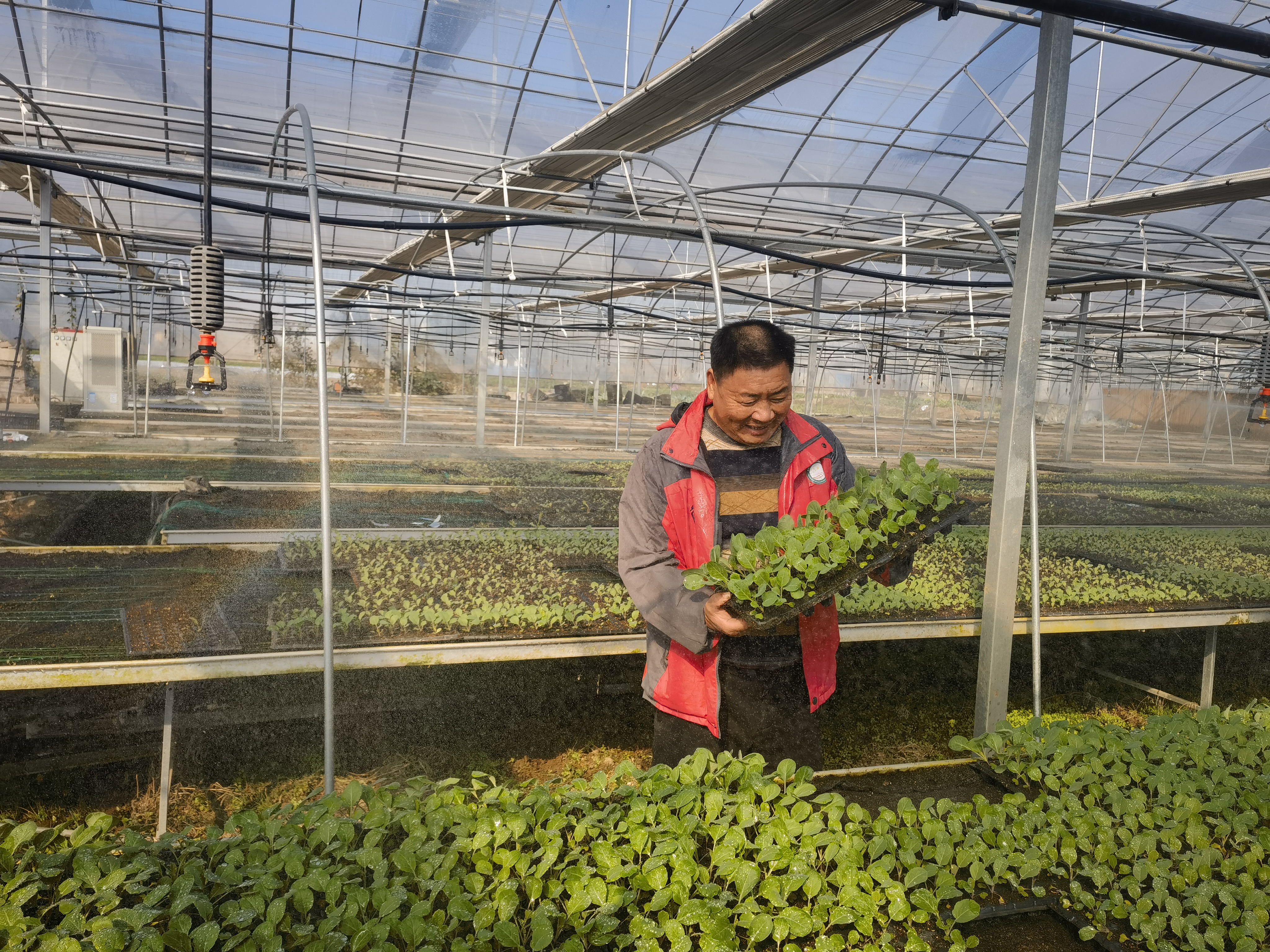 在云梦县四季长青蔬菜种植合作社的育苗大棚中,自动喷淋、温湿度控制、智能降温、自动遮光等设备一应俱全。技术员正通过遥控器操控空中洒水车来回浇灌苗床,为种苗营造适宜的生长环境。