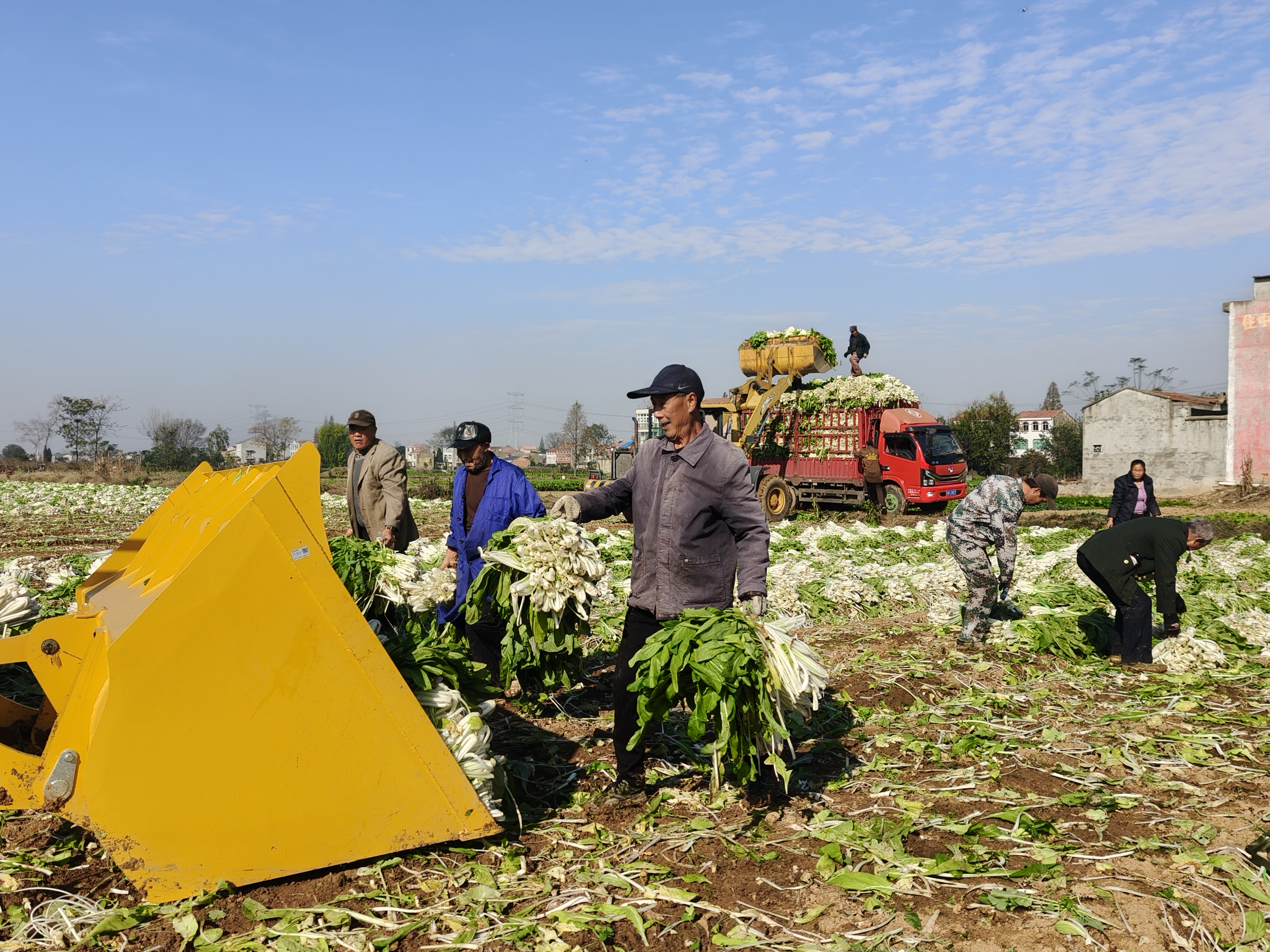 走进湖北硕华农业科技有限公司的种植基地,一派繁忙景象映入眼帘:村民们挎着竹篮、手持镰刀,弯腰穿梭在菜畦间,熟练地采摘、整理、装运新鲜的箭杆白,翠绿的菜叶上还沾着晨露,空气中弥漫着清甜的菜香。“在这里干活不累,离家近还管午饭,一天能挣80块钱,给家里添份收入特别知足!”村民王春凤一边麻利地打包蔬菜,一边笑着说道。