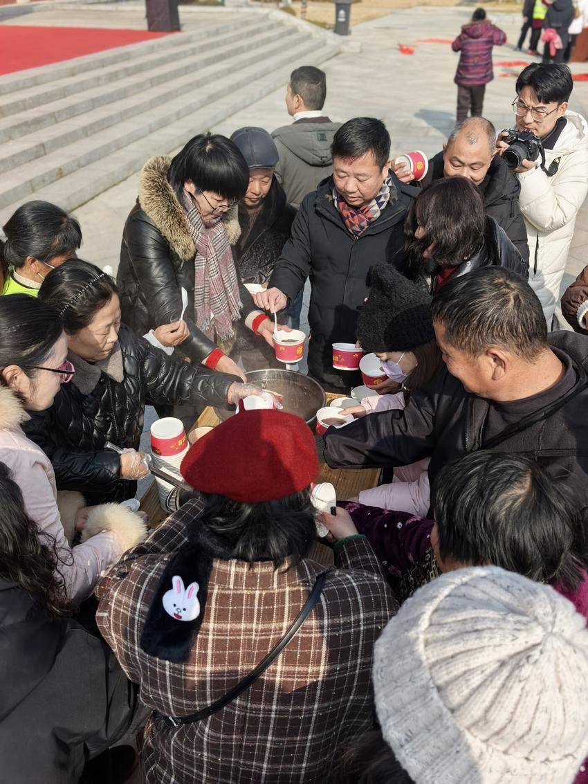 上午十点,活动现场国风氛围感拉满,成为一片古韵与温情交融的海洋。身着飘逸汉服的亲子家庭、汉服爱好者漫步广场,步履间尽显东方雅致,与黄香文化馆的深厚底蕴相映成趣;腊八粥品鉴台旁香气氤氲,工作人员有序分装、暖心派送,市民们手捧热粥,暖意从指尖淌入心底,腊八节气的民俗温情在此静静流淌。