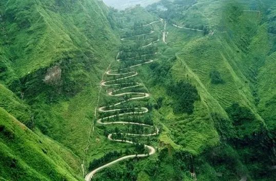 整条公路呈“S”型顺着山势而建,自下而上的盘山公路在满山绿色的衬托下,就像蛇形盘动。
