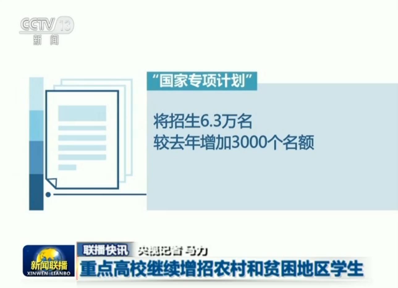 教育部要求,今年重点高校将继续增加农村和贫困地区学生的招生人数。其中“国家专项计划”将招生6.3万名,较去年增加3000个名额;“地方专项计划”比2016年增加10%以上,并对民族自治县实现全覆盖。“高校专项计划”将不少于高校年度本科招生规模的2%。