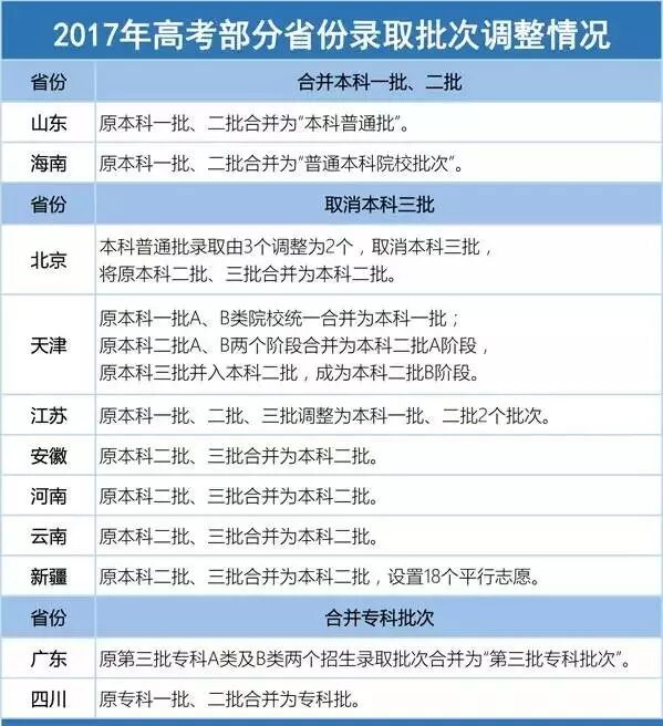 2017年起,山东省夏季高考将原本科一批、二批合并为“本科普通批”,合并后,该省高考录取减少至5个批次。海南省也对原本科一批、二批进行了合并,合并后各批次学校实行平行志愿投档和录取。此外,北京、天津、江苏、安徽、河南、云南、新疆等7个省份也相继取消了本科三批。