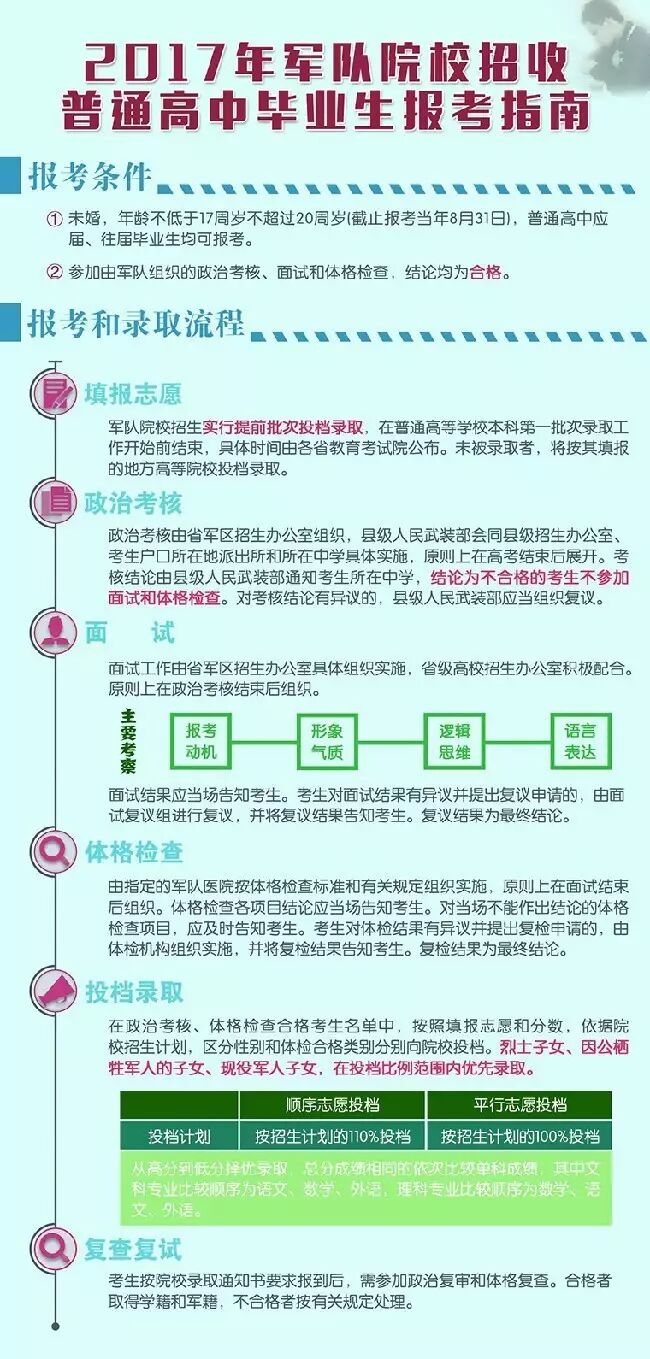 军队没有针对高考考生出台专门的加分政策。高中毕业生报考军校加分,执行教育部发布的面向全国所有高考考生的规定。在此基础上,各省市结合当地实际出台了相应的加分政策,请考生注意查看。(相关链接:首次 | 军改后院校新名称曝光,2017年军队招生单位名录发布)