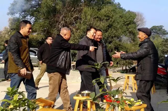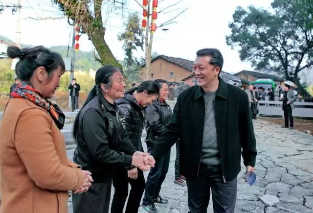春节期间,廖俊波(左一)在政和县松源村慰问群众(2015年2月20日摄)。