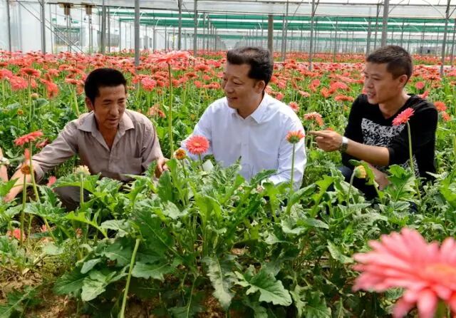廖俊波(中)在政和县铁山镇东涧村向花农了解花卉生产情况(2014年4月18日摄)。