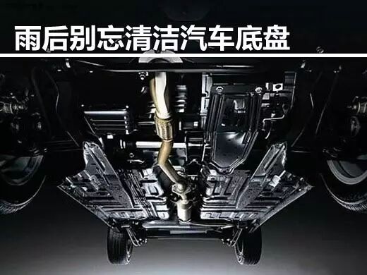 底盘是和地面最贴近的部位,受路况影响特别严重(雨天路况相当不好,万一遇到低洼路面呢?万一淌水呢?万一陷入泥泞呢?),一般这个部位最容易锈蚀斑斑,轮壳处甚至还可能松动穿孔。因此,一定要注意汽车底盘的清洁防锈处理。如果底盘部位有污泥积存,很容易使湿气藏匿其中导致底盘生锈。因此,雨后别忘了清洁汽车底盘,因为你永远也不知道下一秒你的底盘会遭遇什么。