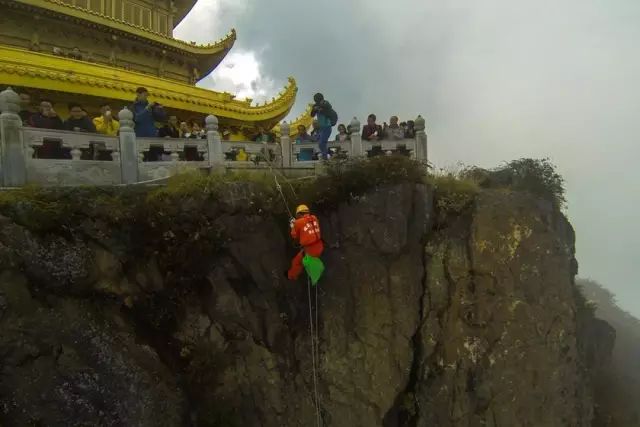 四川峨眉山景区断崖边,护栏之外,一名清洁工在垂直近90度的峭壁上捡垃圾。