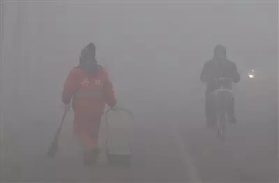一位环卫工人仍然出现在大街上,身上鲜亮的橙色几乎看不出来。霾很重,他们那么少的收入,是否舍得给自己买一个防霾口罩呢?来往的车辆,会不会意外剐蹭到他们呢?他们的身体还好吗?