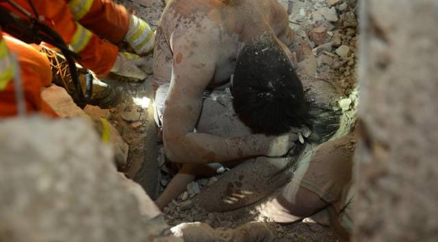 废墟里,营救人员发现一名遇难男子。在他半弯的怀抱里,一个小女孩被保护在里面,仍然活着。