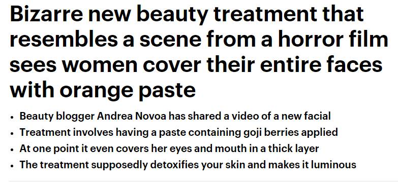 《每日邮报》(Daily Mail)2016年9月7日报道称,一位名为Andrea Novoa的美妆博主,分享了一则视频展示自己美容的新方法,将枸杞做成面膜敷遍自己的全脸......据说,这方法可以排毒养颜,还能让皮肤有光泽。