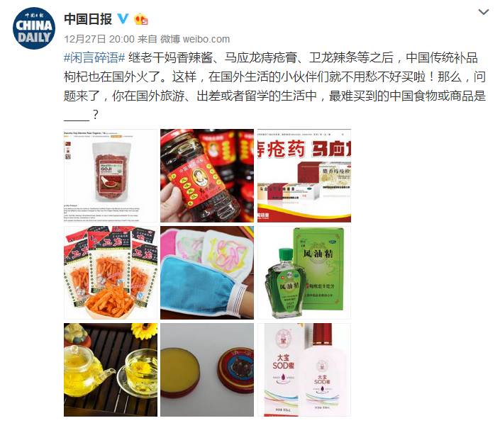 昨日,中国日报官方微博 #闲言碎语# 话题向网友发起征集,留学、旅游、出差在外,最难买到的中国食物或商品是什么?
