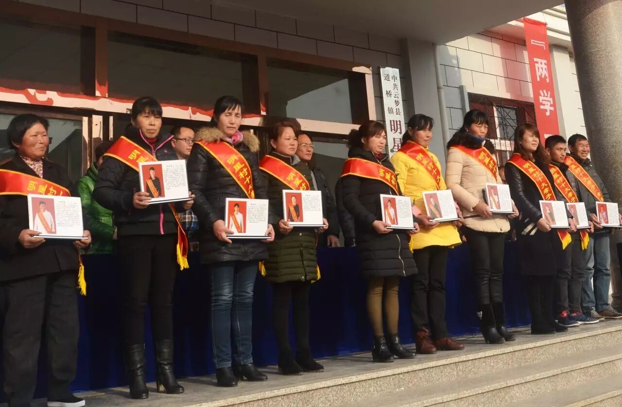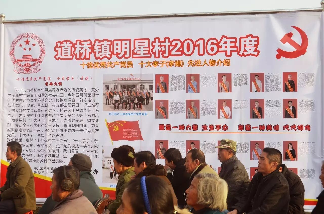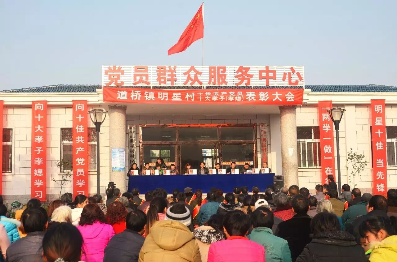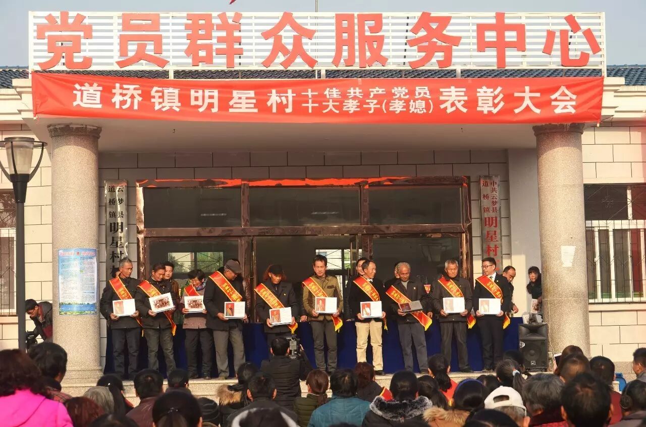 12月30日,云梦县道桥镇明星村召开“十佳共产党员”、 “十大孝子(孝媳)”表彰大会,树立先进典型,深化党员“两学一做”学习教育,弘扬中华民族孝亲敬老传统美德,推进村级党建和乡风文明建设。
