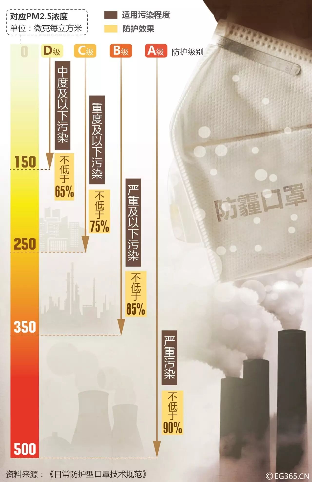 从2016年11月1日起,国家标准《日常防护型口罩技术规范》正式实施,这是我国首个民用防护口罩国家标准。根据《日常防护型口罩技术规范》,防护级别根据空气污染情况由低到高分为D级、C级、B级和A级,分别适用于中度及以下污染、重度及以下污染、严重及以下污染、严重污染,各级对应的防护效果分别为不低于65%、75%、85%、90%。