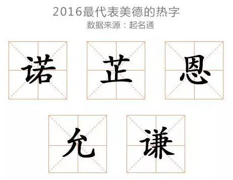 最新一年的热名榜单,还能看出新一代父母对孩子最集中的期望是“阳光、快乐”,传统对女子美丽温柔的要求已经不占主流,男孩起名也不像其父辈更强调坚强伟大、个人奋斗。一些代表美德的字,如诺、芷、恩、允、谦,正开始受到年轻父母的青睐,体现了时代对于“德行”的呼唤。