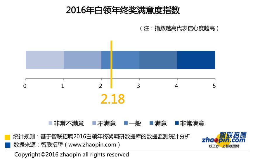 2016白领年终奖满意度仅为2.18,相比2015年的满意度(2.07)略有上升,但总体来看对年终奖的满意度依旧较低,相较于满分5分未达到及格线。