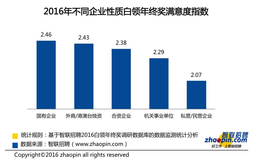 和2015年的数据相比,国有企业白领对年终奖的满意度提升最大,以2.46的指数跃居第一。其次是外商/港澳台独资企业白领,满意度指数为 2.43,略低于国有企业白领。在私营/民营企业就职的白领对年终奖的满意度水平依旧最低,满意度指数仅为2.07。