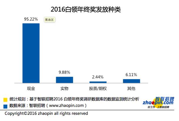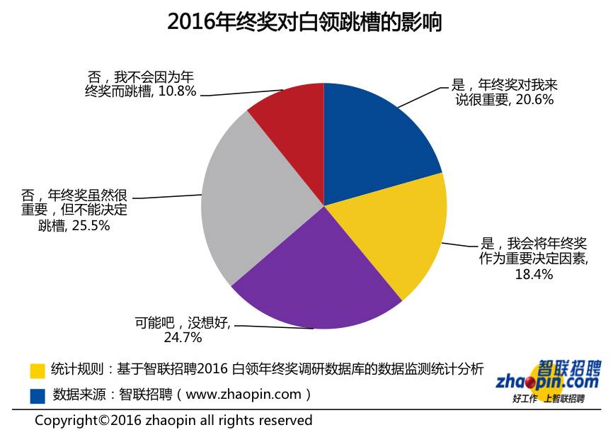 除此以外,有39.5%的白领表示可以拿到年终奖,明显高于2015年13.4%的比例,另外有9.6%的白领表示企业承诺会在年后发放年终奖。