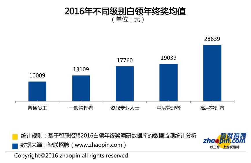 从不同职位级别来看,2016年高层管理者的年终奖均值达到了2.8万元,但对比各个级别白领的年终奖满意度水平,高管们对自己的年终奖并不满意。