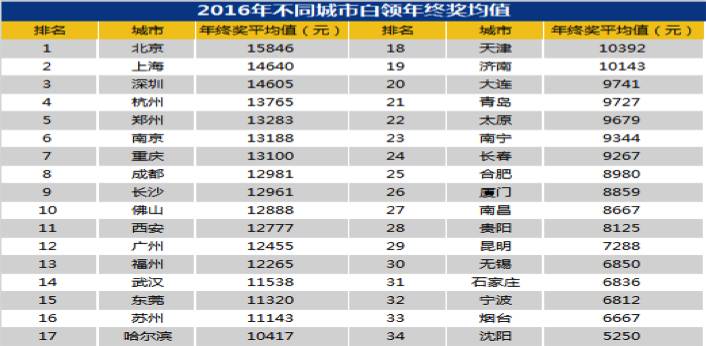 智联招聘这项名为“2016白领年终奖调查”显示, 2016年年终奖的总体均值为12821元。分城市来看,北京以15846元领跑全国;分行业和企业来看,国企、金融行业的年终奖均值最高达到1.7万元。白领在调查时认为,“公司经济效益太低”是影响年终奖的主要原因。