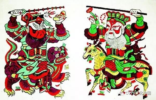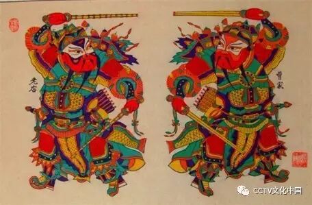 春节贴年画,在我国由来已久。年画,古称“门神画”,其最早的名称叫“门画”。据《风俗通义》记述,在先秦两汉年节宗教信仰有祀门之习俗,故神荼、郁垒成为我国最早的司门之神。晋代宗懔《荆楚岁时记》道:“正月一日,给二神贴户左右,左神荼右郁垒,俗谓之门神。”