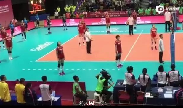 去年7月16日,中国女排姑娘们在香港参加世界女排大奖赛,赛前热身时,现场突然响起中华人民共和国国歌,正在热身的中国女排姑娘们停下热身活动,站在原地对国旗行注目礼,看台上的观众也自发站了起来。