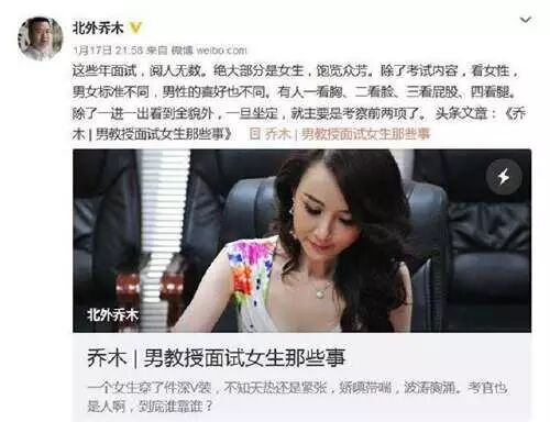 近日微博认证为“北京外国语大学副教授乔木”的账号“北外乔木”发文称该校研究生考试“面试女生主要看胸脸”,北外对此回应:乔木早已调离教学岗,正在调查并将依规处理。