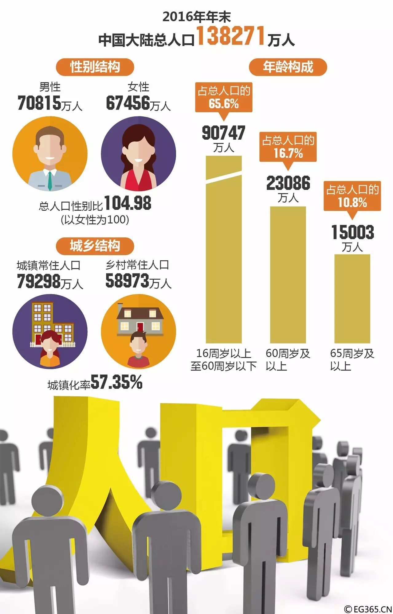 国家统计局消息,2016年年末中国大陆总人口138271万人,比上年末增加809万人。其中,男性人口比女性人口多3359万。