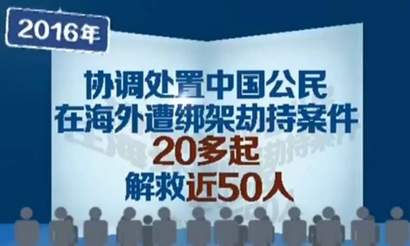 2016年,中方开展各类较大规模撤离行动近10起,成功将2500多名公民带离险境;协调处置中国公民在海外遭绑架劫持案件20多起,解救近50人。