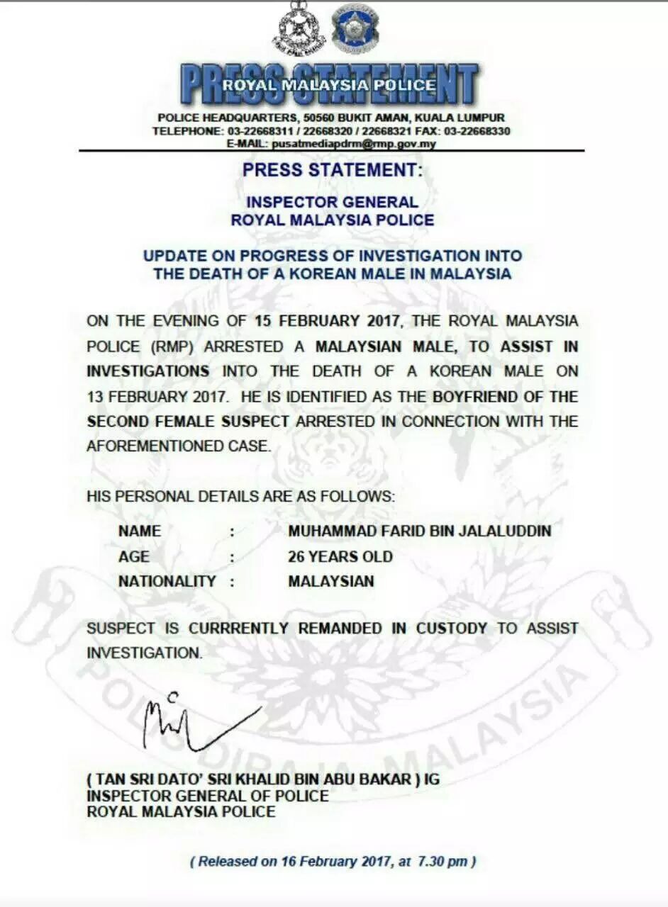 △马来西亚皇家警察总部就“朝鲜男子死亡事件”最新调查进展发布声明