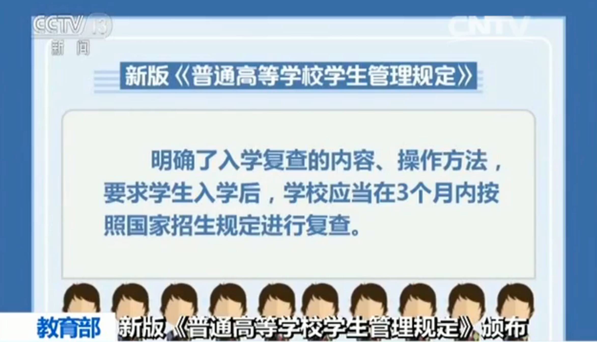 教育部近日颁布了新修订的《普通高等学校学生管理规定》,《规定》涉及学生的权利与义务、学籍管理、奖励与处分等诸多方面,将于今年9月1日起施行。
