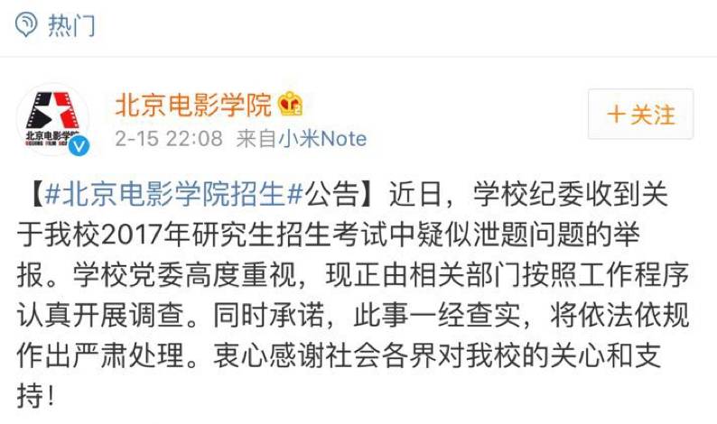 针对近期“考研泄题”传闻,北京电影学院官方回应:近日,学校纪委收到关于我校2017年研究生招生考试中疑似泄题问题的举报。学校党委高度重视,现正由相关部门按照工作程序认真开展调查。