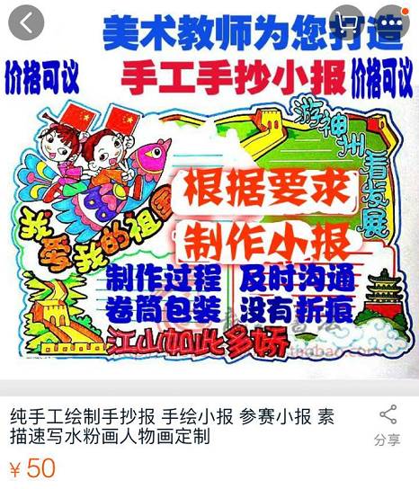 令记者感到意外的是,手工作业代写等业务主要购买者并不是学生本人,而是家长。据卖家介绍,孩子们忙着赶作业时,很多家长为了减轻孩子和自己的压力,就会上网购买枪手代画手抄报、代做手工作品。