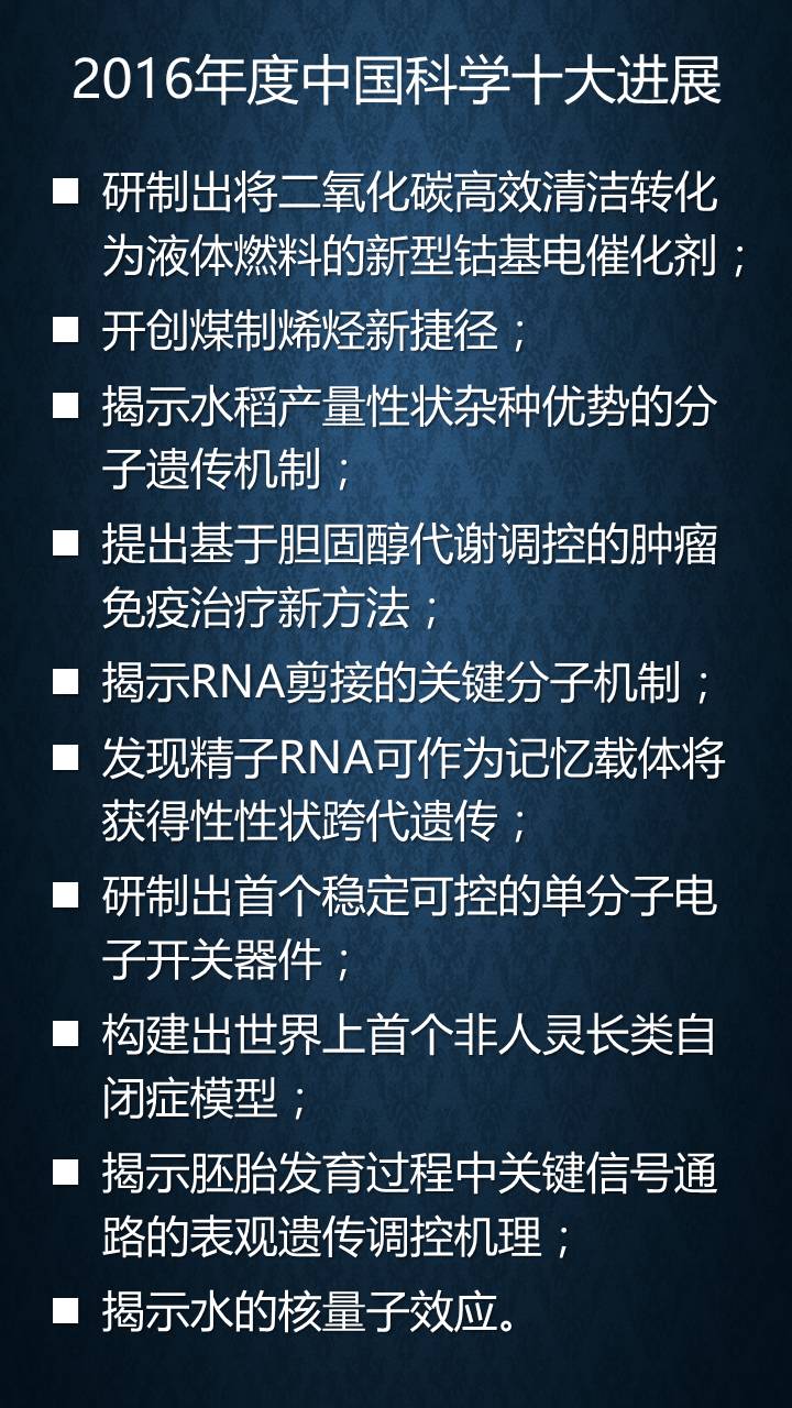 科技部昨日发布2016年度中国科学十大进展,涵盖新能源、医药卫生、动物遗传等诸多行业,其中生物领域占据6项。