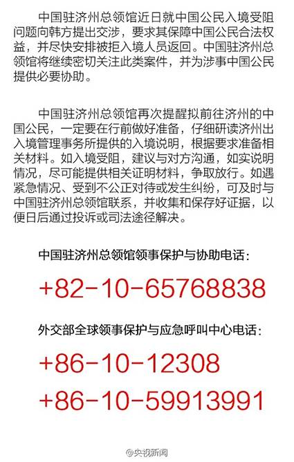中国驻济州总领馆近日就中国公民入境受阻问题向韩方提出交涉。中国外交部和驻济州总领馆再次提醒,拟前往济州的中国公民做好行前准备。