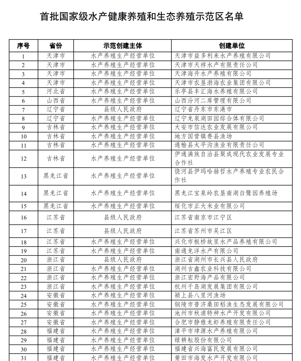 按照《国家级水产健康养殖和生态养殖示范区管理办法(试行)》(农渔发﹝2021﹞13号)和《关于开展2021年国家级水产健康养殖和生态养殖示范区创建示范活动的通知》(农渔养函﹝2021﹞61号)要求,农业农村部组织开展了首批国家级水产健康养殖和生态养殖示范区创建示范活动。经各主体自愿申请,县市省逐级审核,部级复核确认,共有65个申报主体符合标准。现将国家级水产健康养殖和生态养殖示范区名单予以公示,公示期为2021年12月3日至16日。公示期间,如有异议,请与农业农村部渔业渔政管理局联系。