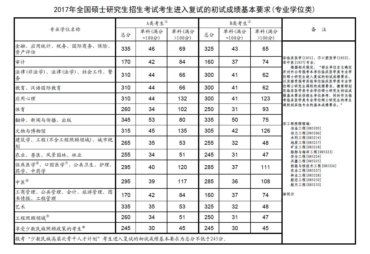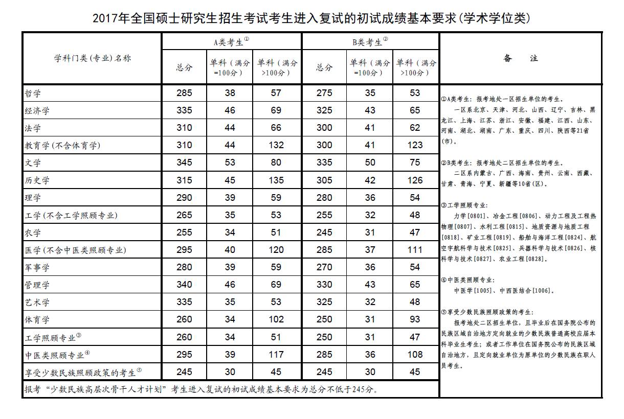 教育部昨日公布2017年考研复试国家线及调剂相关事项。其中学术学位类A类考生:经济学335,法学310,文学345,工学(不含工学照顾专业)265,医学(不含中医类照顾专业)295……了解各专业学位类考生成绩要求,请戳↓